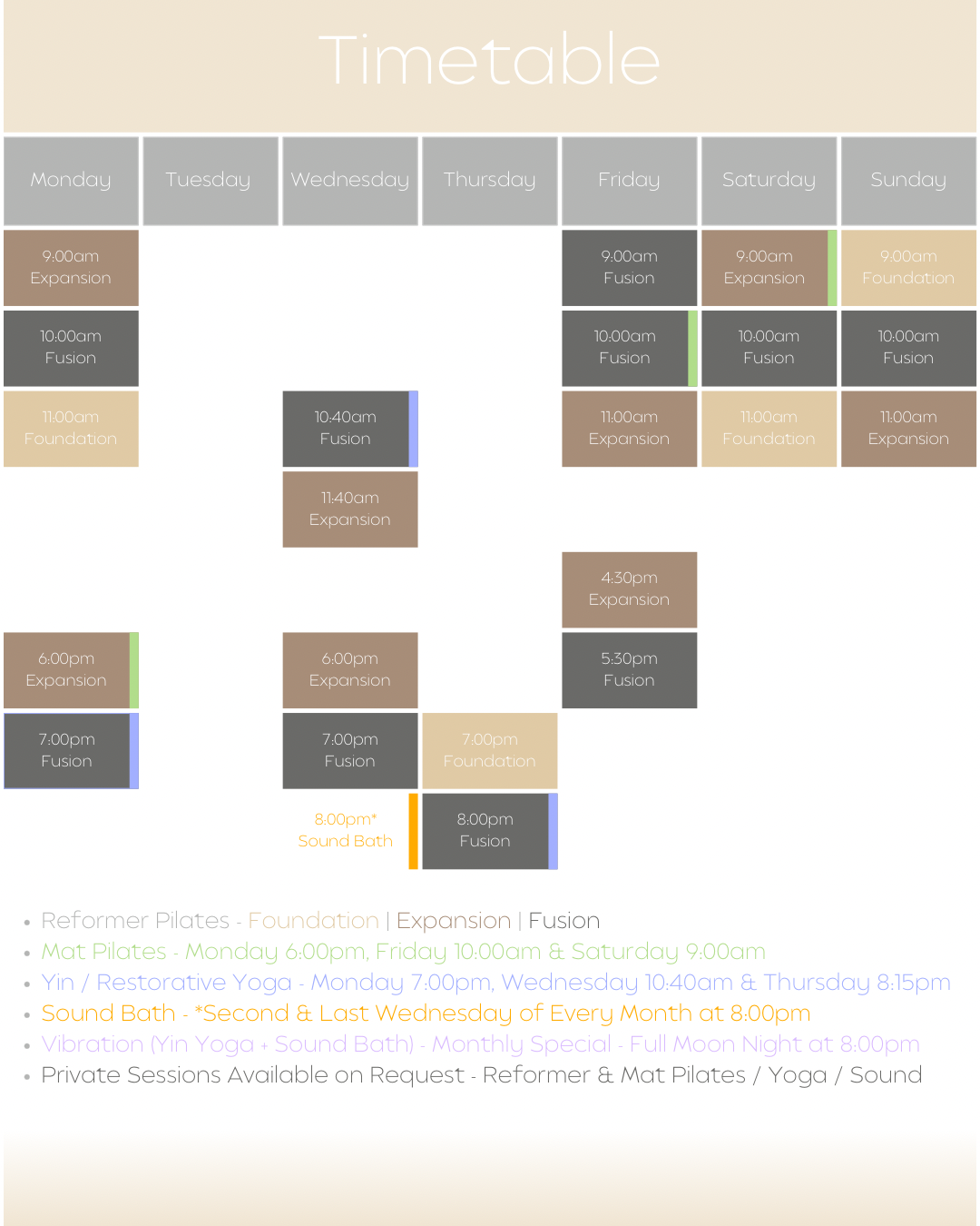 Abode offers 3 types of Reformer Pilates Group Class; Foundation, Expansion and Fusion.